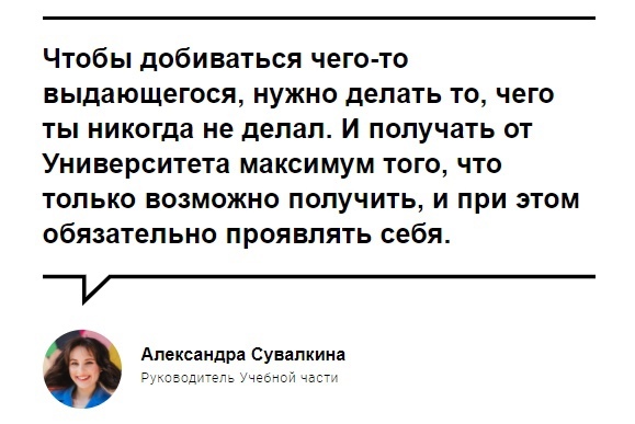 Руководитель учебной части Александра Сувалкина в интервью ниже рассказала о том, как учебная часть УИИ выглядела в самом начале пути, поделилась мыслями о том, почему обучение - это двухсторонний процесс, а также рассказала, почему важно участвовать во всех мероприятиях, которые мы проводим.